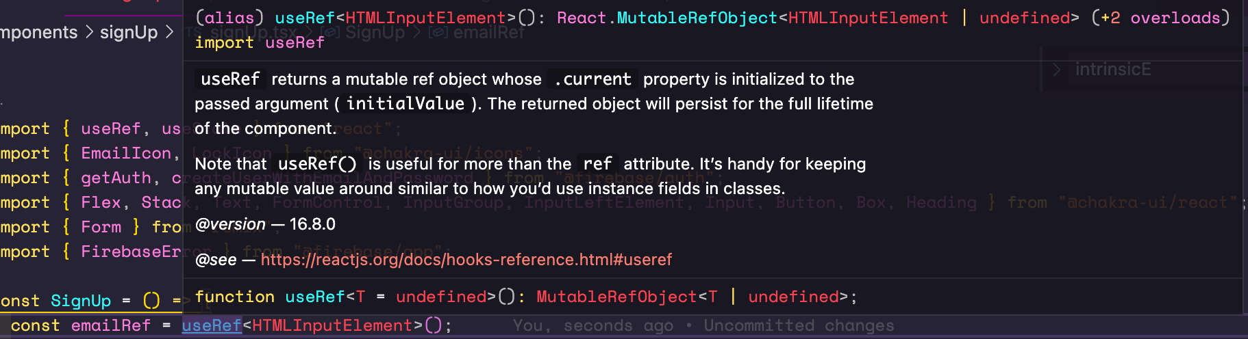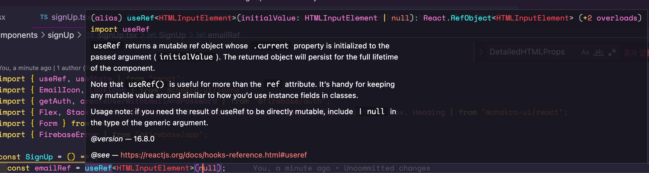 useRef가 반환하는 녀석을 보면 MutableRefObject<HTMLInputElement | undefined>를 반환하는 걸 볼 수 있다. 뭐, T를 HTMLInputElement로 주고 초기값이 undefined니까 자연스럽게 T가 HTMLInputElement|undefined로 추론되는 것.