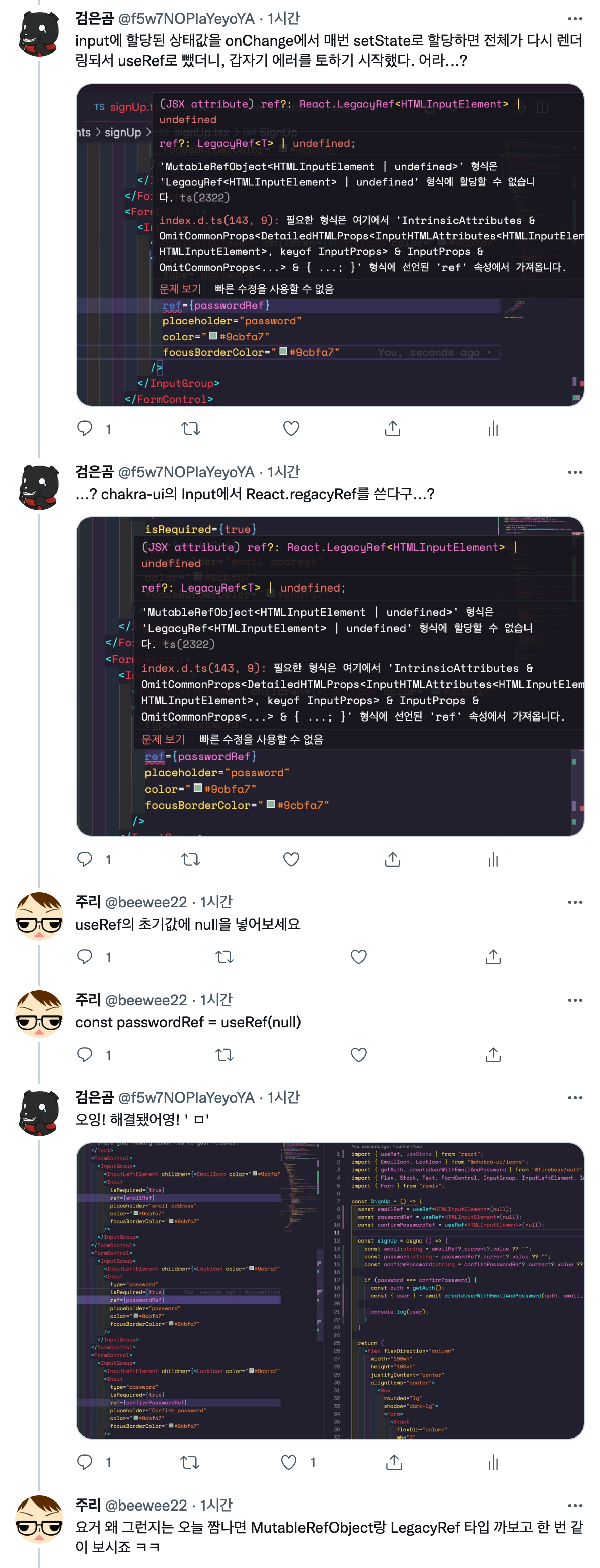 Input의 onChange에 setState를 할당해서 값이 바뀔때마다 상태값이 변경되도록 설정했더니, 매번 Input에 입력한 값이 변경될 때마다 렌더링이 다시 되는 기염을 토했다. 당연한 얘긴 줄 알고 있었는데 주리님이 보시고 ‘이럴때는 이런 식으로 최적화가 가능해요’라고 말씀해주셔서, react-hook-form, react-final-form, formic같은 애들에 대해 알게됐다. 조금 고민해보다가 ‘엥? 얘는 일단 간단하니까 useRef만 써도 되는거 아닐까?’라는 결론에 도달, Input에 ref를 냅다 꽂아버렸더니 LegacyRef에 MutableRefObject를 할당할 수 없다는 에러가 발생했다.