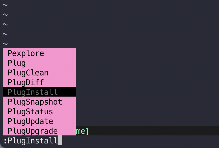 정상적으로 vim-plug가 설치됐는지 확인하려면, vim을 입력하고 :Plug를 입력한 뒤 Tab을 눌러봅시다. 정상적으로 설치된 경우, 다음과 같은 화면을 볼 수 있습니다.