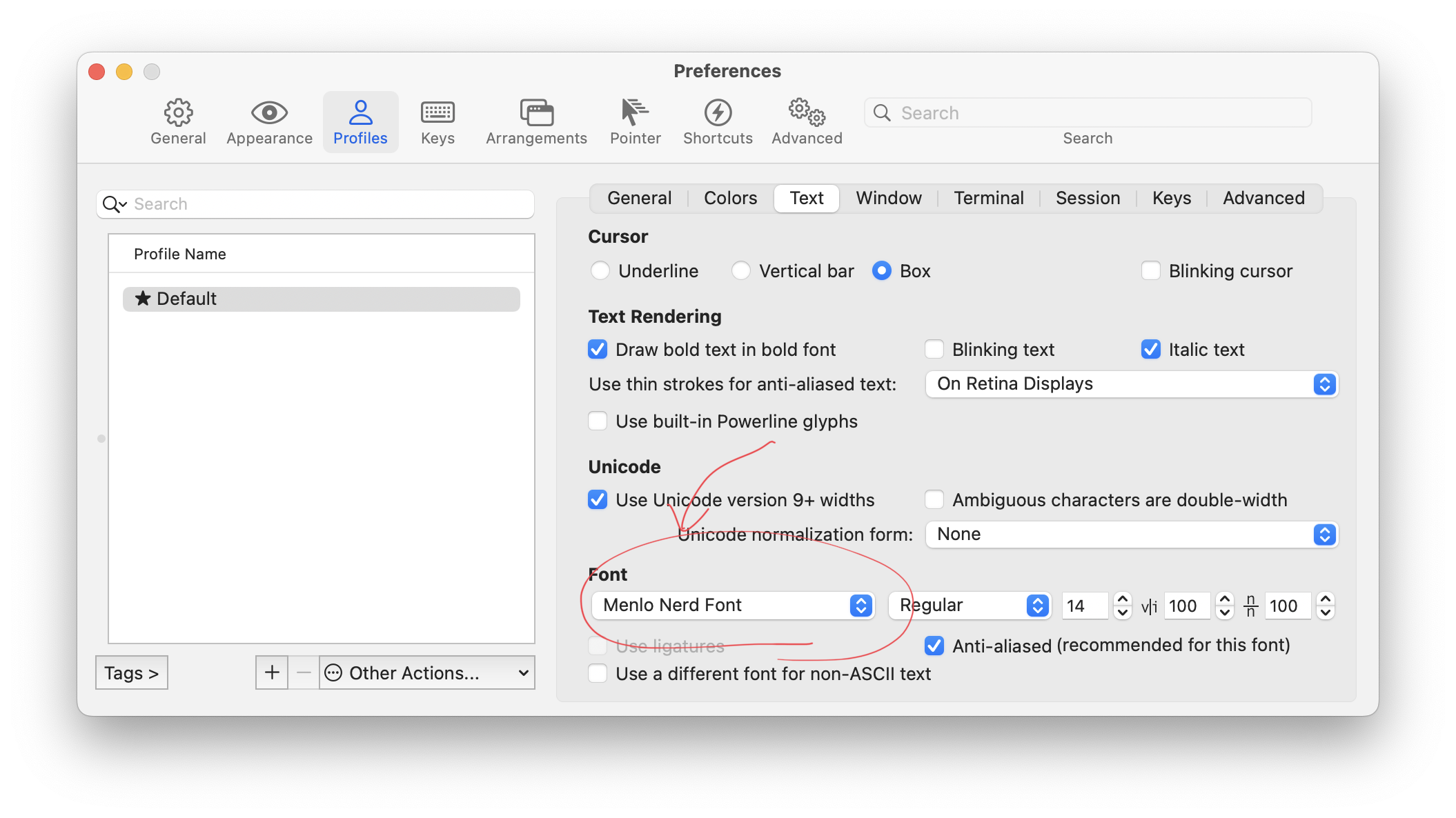 macOS의 iTerm2를 기준으로 다음과 같이 설치된 Menlo Nerd Font를 적용해줍니다. 이제 nerdfont.vim과 fern-renderer-nerdfont.vim 플러그인을 설치하도록 합시다.