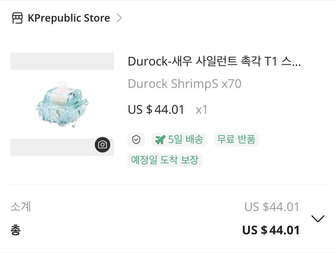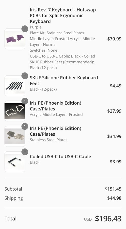 우선 https://keeb.io/collections/iris-split-ergonomic-keyboard/products/iris-keyboard-split-ergonomic-keyboard 에서 Rev.7 기판을 주문했습니다. 플레이트 킷, 미들 레이어, USB-C to C 케이블, 미끄럼 방지 발판 스티커... 스위치까지 집어들고 장바구니에 담은 뒤, 계산을 하려고보니 배송료가 50불이 추가로 붙습니다. 히이이이이이익... 통관시 관세가 붙는게 배송료 포함 200불인지 배송료 제외 200불인지 가물가물했지만, 알아보는 것 보다는 스위치를 빼는게 빠를 것 같아서 일단 스위치를 빼고 얼추 200불이 안되는 가격에 주문을 마친 뒤 놀란 가슴을 쓸어내립니다.