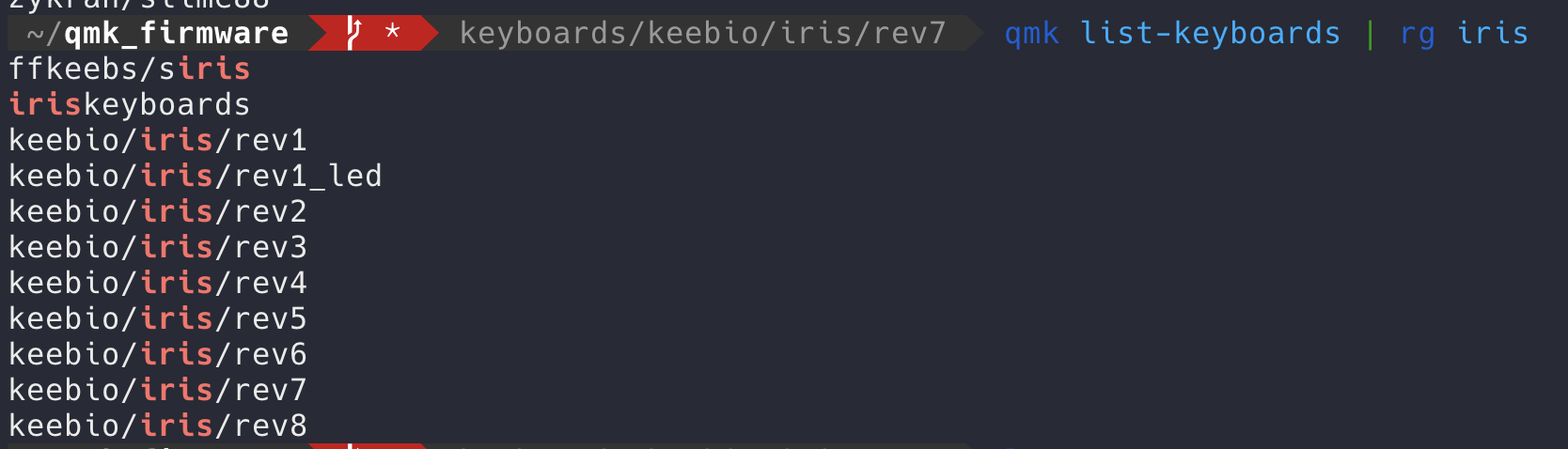 keebio/iris/rev7 자리에는 펌웨어를 만들 키보드 명을 입력하면 되는데, 위의 qmk setup 실행 결과 중 QMK home으로 표시되는 경로를 기준으로, keyboards 하위 경로에 프리셋 파일들이 있으므로 참고하도록 하자. 만약 무엇을 입력해야될지 모르겠다면 다음과 같이 qmk list-keyboards를 입력해서, 지원하는 키보드 리스트를 확인해보면 된다.