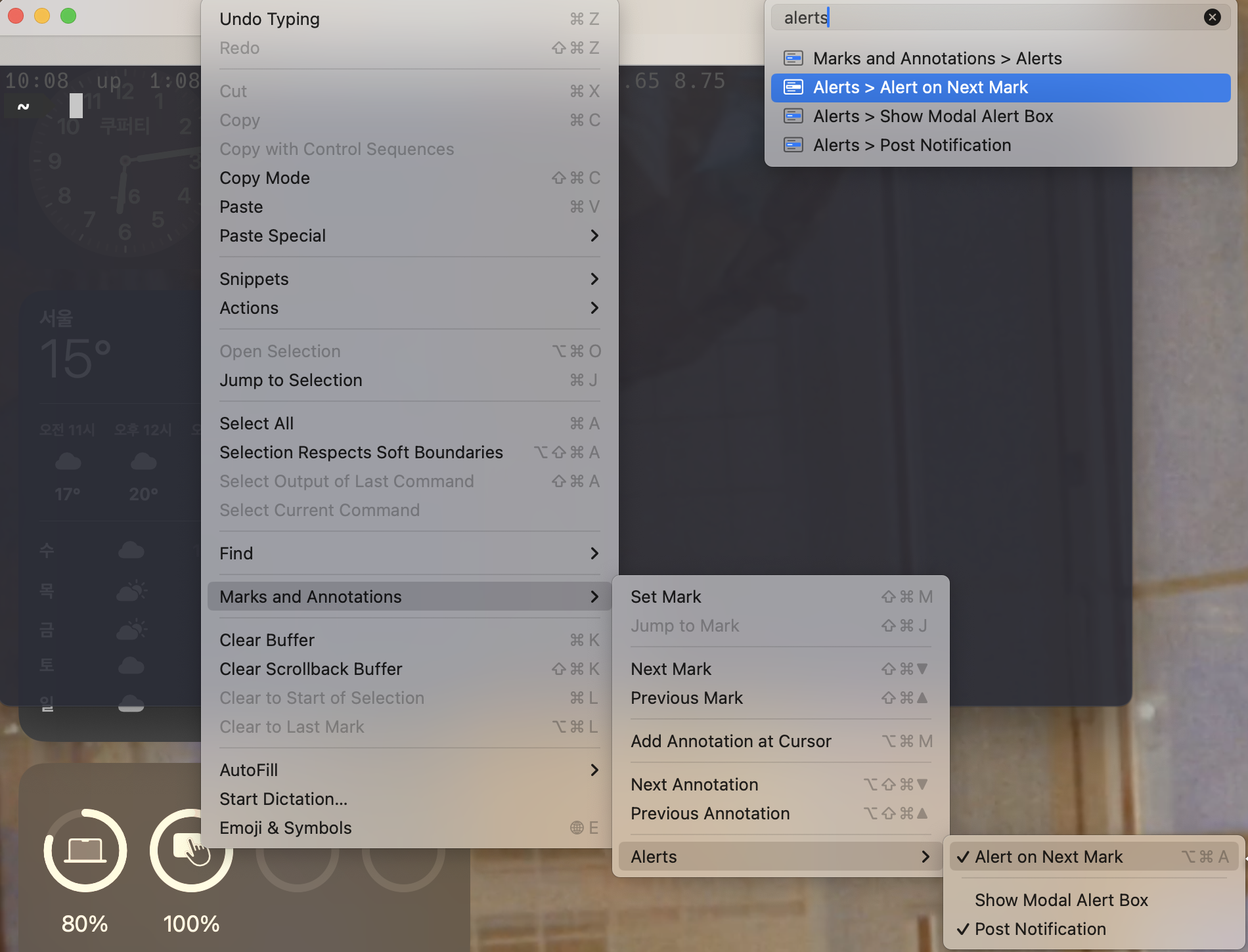 CMD+OPTION+A를 누르면 나오는 표시로, 터미널에서 오랫동안 수행되는 작업을 실행할 때, 실행이 종료되면 알림을 띄워주는 기능이다. Edit > Marks and Annotations > Alerts > Alert on Next Mark를 통해서도 실행할 수 있다.