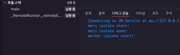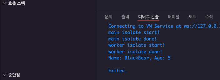 실행 결과는 모두가 예상할 수 있듯, main isolate start! ➡️ worker isolate start! ➡️ main isolate done! ➡️ worker isolate done! ➡️ Name: BlackBear, Age: 5 순서로 문자열을 출력하게 됩니다. Future.delayed()를 통해서 15초를 대기하는 동안 호출 스택에 worker isolate가 표시되는 것을 주목해주세요. worker isolate done! 문자열을 출력하고 난 뒤에는 호출 스택에서 worker isolate가 사라지는 것을 볼 수 있는데, Isolate.run()을 사용해서 Isolate를 생성하는 경우에는 Isolate에 넘겨준 함수를 실행한 뒤에 자동적으로 종료된다는 것을 알 수 있습니다.