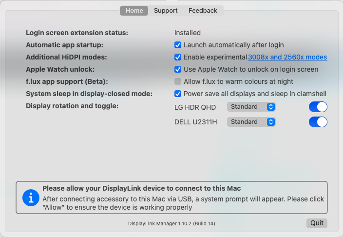 D6000을 맥북에 연결하고 화면이 나오지 않는다면, DisplayLink macOS Software 페이지에서 DisplayLink Manager를 받아서 설치한 뒤 실행해주자. 말을 바꾸면 DisplayLink Manager가 실행되지 않으면 화면이 출력되지 않는다는 얘기가 되므로, 옵션에서 Launch automatically after login을 항상 활성화해주자. 외장 모니터를 하나밖에 지원하지 않는 맥북에서는 테스트해보지 못했지만, 아무튼 내 맥북에서는 잘 나온다. (...)
