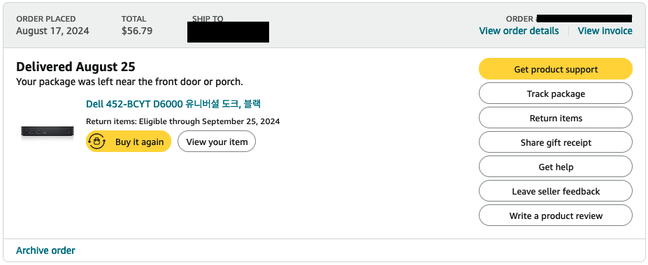 당근 마켓에서 도킹 스테이션을 알아보던 중 우연히 Dell사의 D6000 도킹 스테이션을 발견했다. 썬더볼트3을 지원하는 제품으로 USB-C 포트가 하나밖에 없다는 건 아쉬운 점이지만, DP포트 두 개와 HDMI포트 하나가 달려있어 총 세 개의 모니터에 연결할 수 있는 도킹 스테이션이었다. 구매를 할까, 말까 고민하며 스펙을 알아보기 위해서 구글링을 하다보니, 미국 아마존에서 중고 제품이 당근 마켓보다 싸게 올라와있는 것이 아닌가? 환율을 고려해도 5만원은 저렴한 가격에 올라와있기에, 스펙을 알아보다 말고 바로 구매하기로 결정했다.
