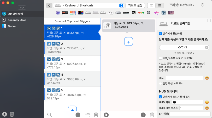 문득 전 세계에 나만 이런 변태같은(...) 환경에서 일하는 것도 아닐거고, 누군가는 나와 같은 고민을 하지 않았을까... 하는 생각에 구글에 검색해봤다. 다행히도 나같은 변태가 있었다! ^ ㅇ^) 유료 툴이기는 하지만 BetterTouchTool을 사용해서 단축키를 설정하면, 마우스 포인터를 순식간에 이동할 수 있었다.