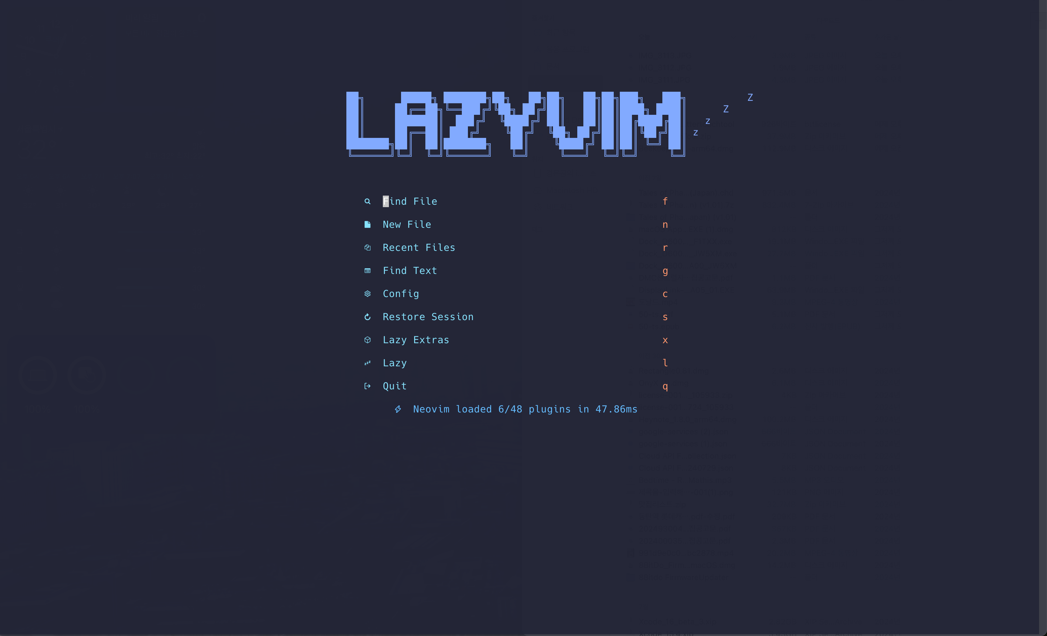 Lazyvim installation 페이지에서 설치하는 방법을 확인할 수 있는데, 대단한 거 없이 neovim 설정 파일을 날려버린 뒤 Lazyvim/starter에 있는 설정 파일을 덮어씌우면 된다.(...) 아이리스 키보드에 CMD+ALT키를 특수키로 할당해놨기 때문에, 특수키와 숫자만 누르면 간단하게 터미널에서 터미널로 포커스가 이동되는 환경이 만들어진 셈이다. 와! 신난다!
