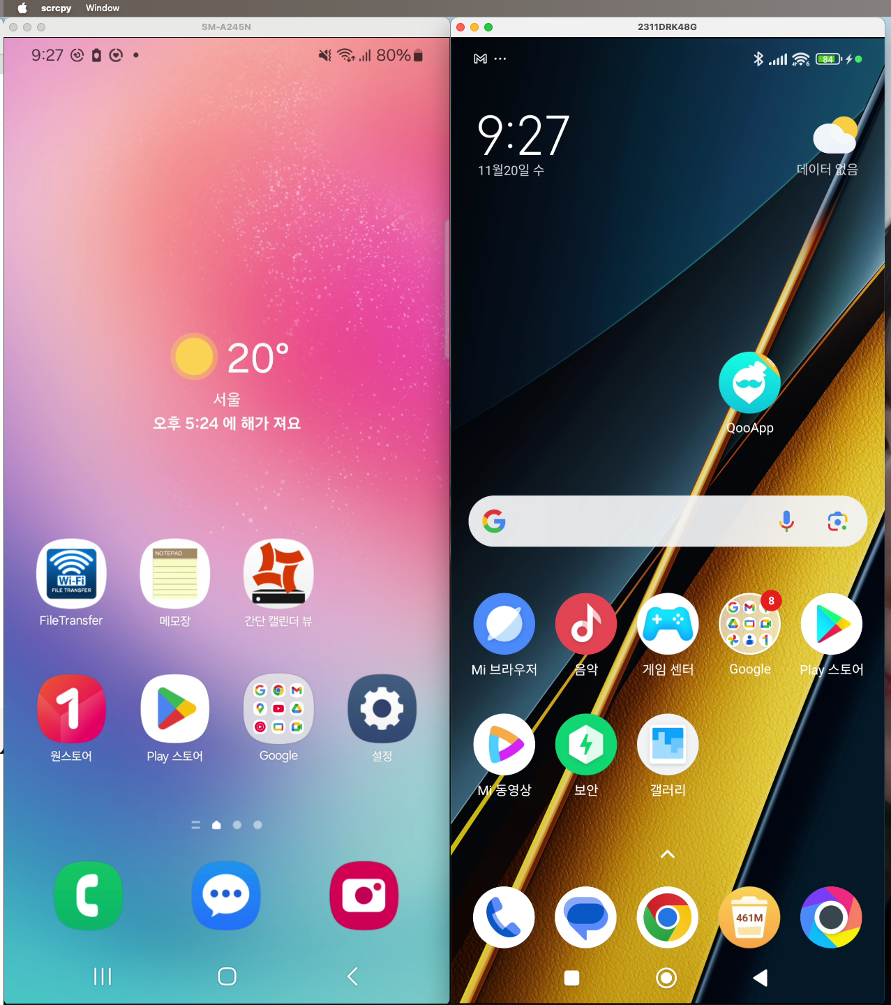 평소에는 디버깅을 위해서 안드로이드 스튜디오의 Running Device 툴을 사용해서, 에뮬레이터를 띄우거나 혹은 USB/Wi-Fi로 연결되어있는 장비의 화면을 띄우곤 했다. 다만 이 경우에는 프레임이 제한되거나 화면 품질이 저하된다던가 하는 문제가 있었다. 그래서 찾다가 발견한 것은 scrcpy. 윈도우나 리눅스를 사용하고 있다면 위의 깃허브 레포지터리를 확인하도록 하자. 이번 글에서는 맥에서 안드로이드 화면을 미러링하는 방법만 다룬다.