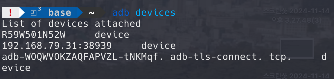 Android Debug Bridge는 안드로이드 개발 시 디버깅을 위해, 기기와 통신할 수 있는 툴이다. 디버깅 모드를 활성화한 뒤 PC와 동일한 네트워크에 Wi-Fi로 연결되어있는 경우에는 무선으로 연결할수도 있고, 유선으로 연결하는 것도 가능하다. 자세한 사용방법은 아래의 페이지를 참조하자. adb devices를 입력하면 유/무선으로 연결된 장치 리스트가 표시된다.
