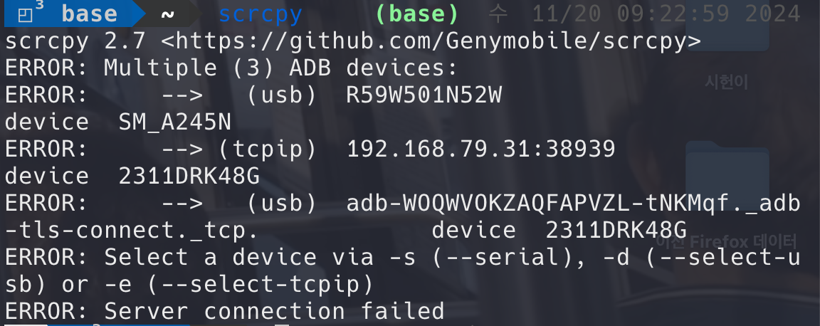 만약 기기가 여러대 연결되어있다면, 아무런 옵션 없이 scrcpy를 실행했을 경우 다음과 같은 에러가 발생한다. 이는 ADB에서도 마찬가지인데, 어느 장비에 연결할 것인지 Android Device Bridge에서 결정할 수 없기 때문에 발생하는 상황이다.